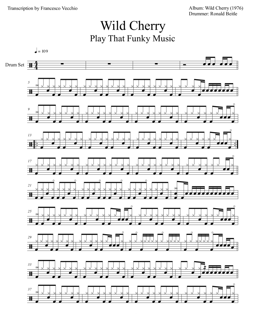 The full drum sheet music for "Play That Funky Music" by Wild Cherry, from the album Wild Cherry (1976) with Ronald Beitle on drums.