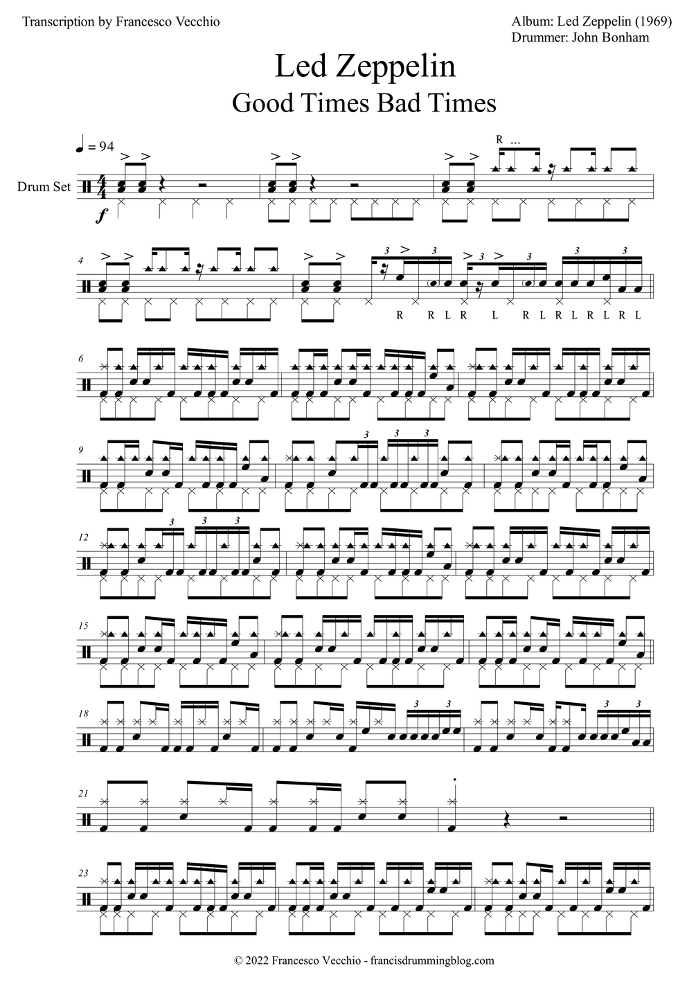 The full drum sheet music for "Good Times Bad Times" by Led Zeppelin, from their debut album with John Bonham on drums.