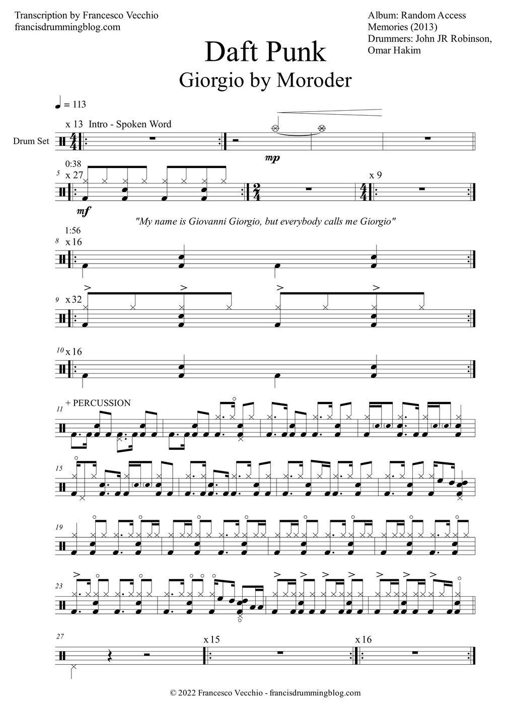 The full drum sheet music for "Giorgio by Moroder" by Daft Punk, from the album Random Access Memories (2013) with John JR Robinson and Omar Hakim on drums. The drum transcription also includes Omar Hakim's amazing solo and a notation key.