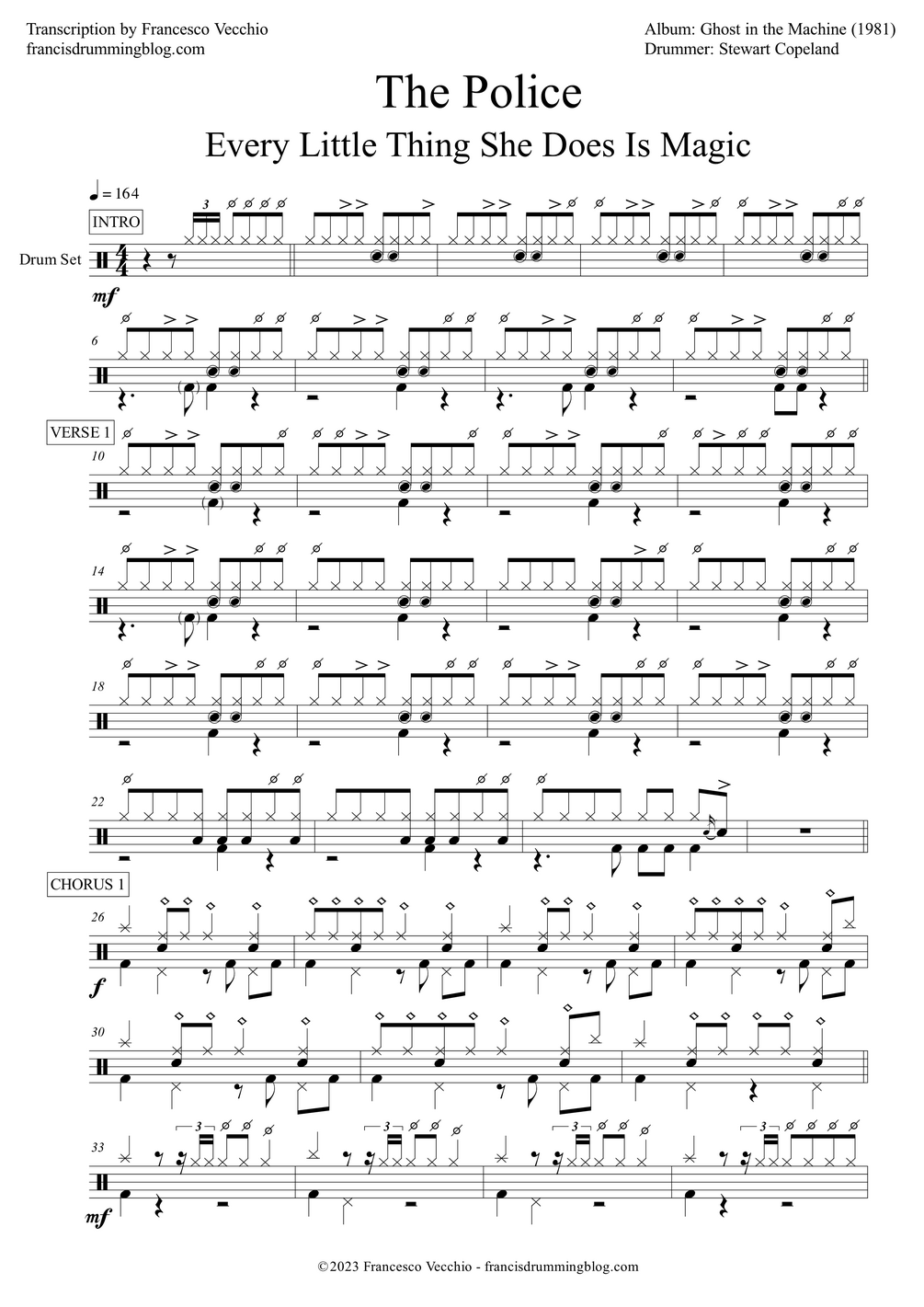 The full drum sheet music for "Every Little Thing She Does Is Magic" by The Police, from the album Ghost in the Machine (1981) with Stewart Copeland on drums. Includes in a printable PDF file the note-for-note drum transcription and a notation key.