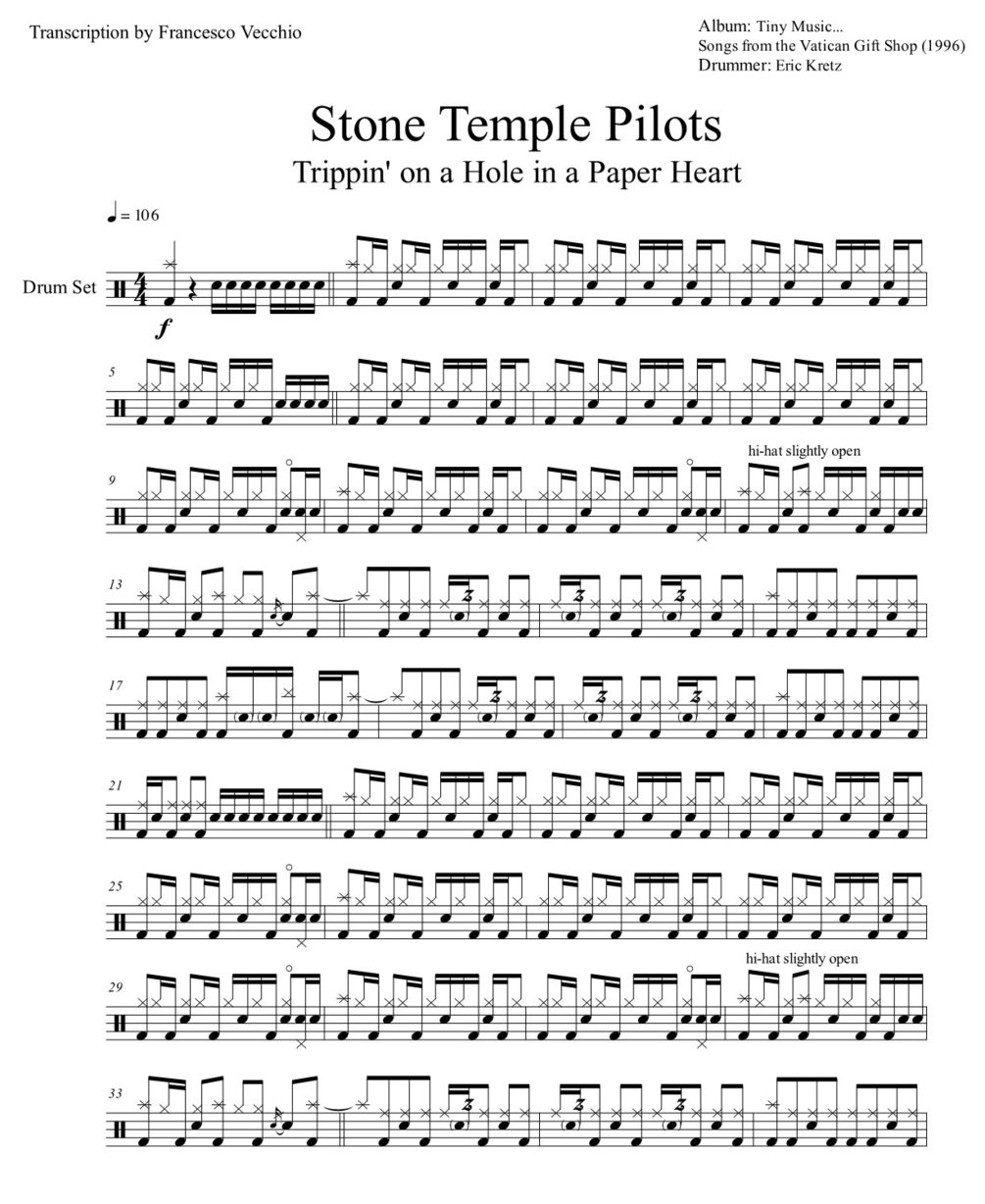 The full drum sheet music for "Trippin' on a Hole in a Paper Heart" by Stone Temple Pilots, from the album Tiny Music... Songs from the Vatican Gift Shop (1996) with Eric Kretz on drums.